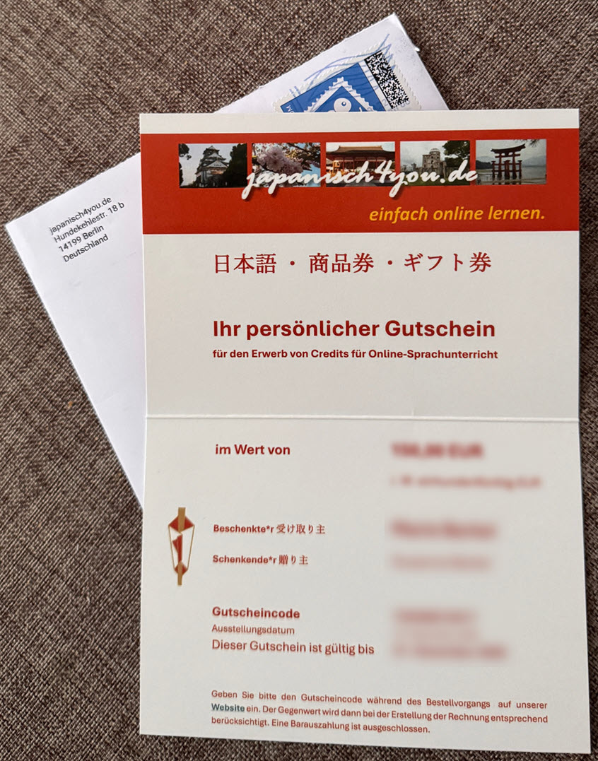 Sie suchen ein individuelles und persönliches Geschenk für einen Japan-affinen lieben Menschen? Wie wäre es mit einem Geschenkgutschein für eine Bestellung von Online-Unterricht, z. B. Einzelunterricht, Vorbereitungskurs für einen geplanten Schüleraustausch … Bitte geben Sie bei der Bestellung den vollständigen Namen und die Adresse der/des Beschenkten an, da der Gutschein personenbezogen ausgestellt wird. Geschenkgutscheine können von der/dem Beschenkten innerhalb von 3 Jahren über unsere Website eingelöst werden.